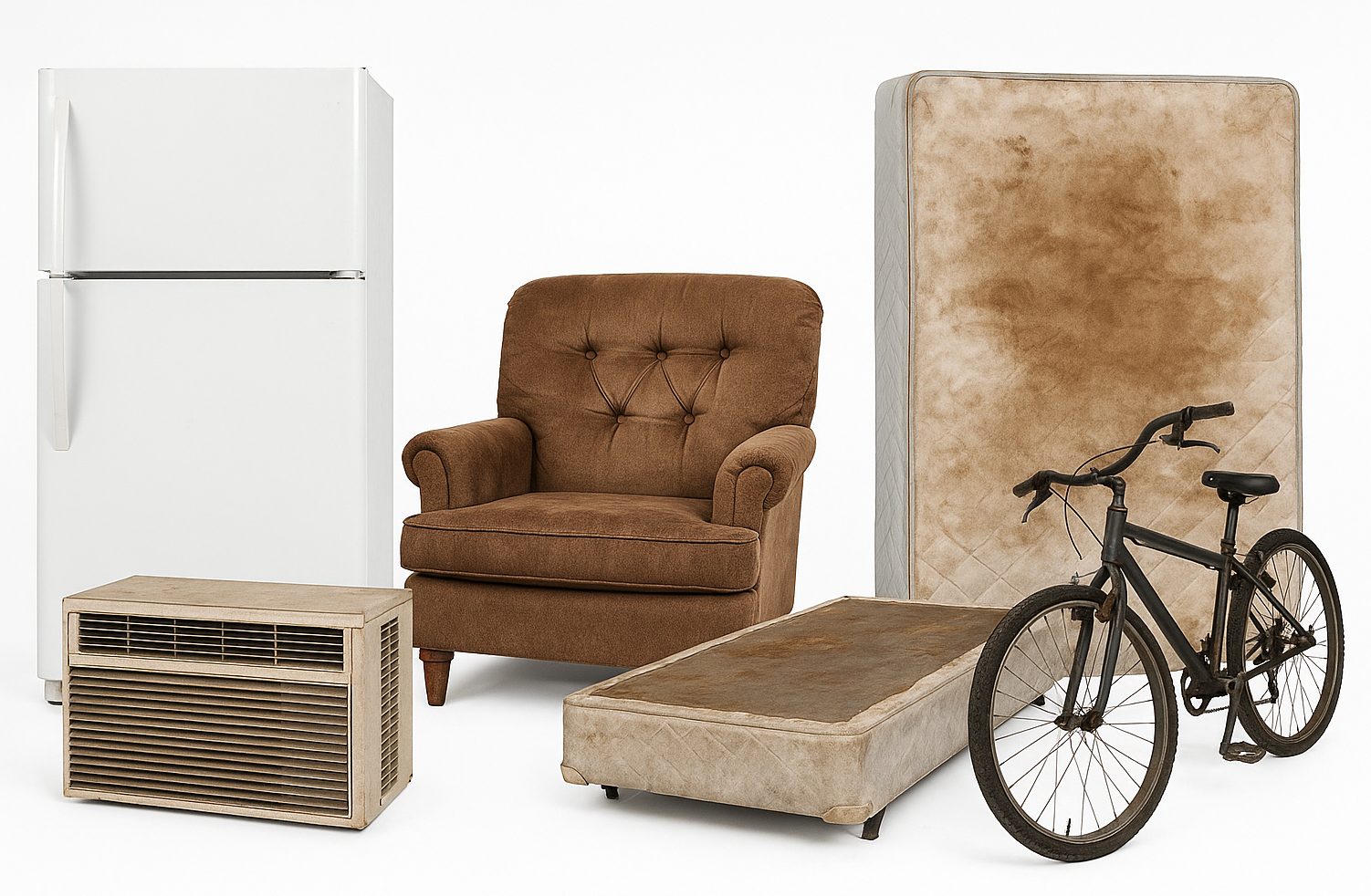 Our junk removal service specializes in the pickup and proper disposal of a wide range of household, commercial, and construction-related waste. This includes, but is not limited to: appliances, baby equipment, BBQs and grills, bicycles, bulky items, cardboard boxes, carpeting and rugs, construction waste, electronics, oversized junk, exercise equipment, furniture, garbage and general refuse, glass, household junk, mattresses and box springs, office and business junk, tools, pianos, playsets and trampolines, pool tables, refrigerators and freezers, rims, scrap metals, sports equipment, and televisions.